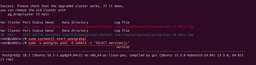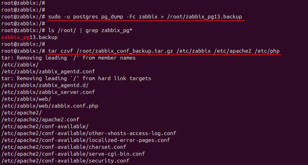 > sudo -u postgres pg_dump -Fc zabbix > /root/zabbix_pg13.backup