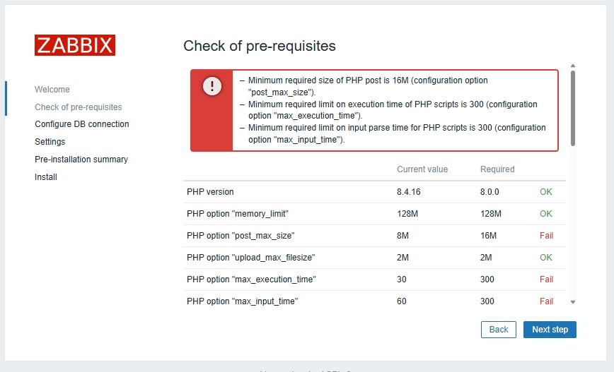 Sonrasında ise ip adresinizle Zabbix web arayüzüne erişmeye çalıştığınızda yukarıdaki gibi bir hata alıyorsanız, aşağıdaki adımları uygulayarak bu sorunu giderebilirsiniz.